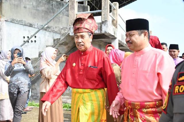 Gubernur Riau H Syamsuar disambut Bupati Bengkalis Amril Mukminin saat menghadiri Puncak Festival Mandi Safar.