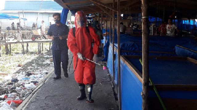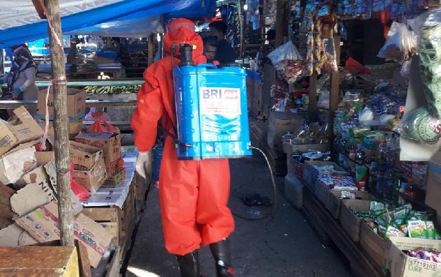 Penyemprotan menyisir di tepian sungai arena pasar yang sudah dikosongkan pedagang