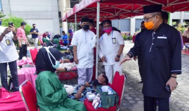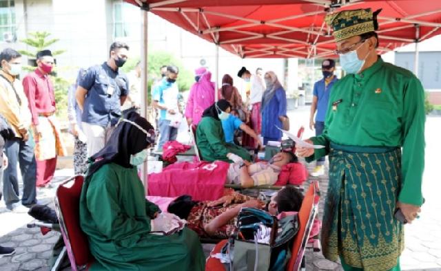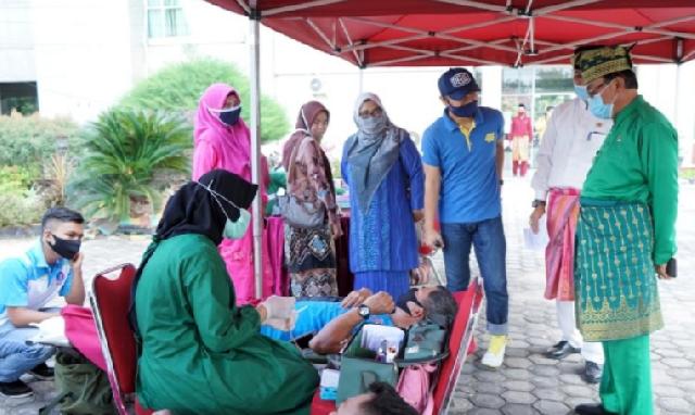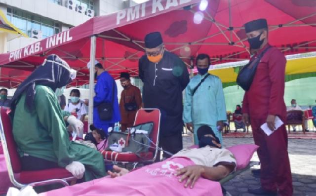 TEMBILAHAN (MR) - Palang Merah Indonesia (PMI) Kabupaten Indragiri Hilir (Inhil) bekerja sama panitia Milad Ke-55 Kabupaten Inhil dengan menggelar kegiatan bakti sosial Donor Darah bagi ASN/ Non ASN di Lingkungan Pemkab Inhil, Jumat (12/6/2020).