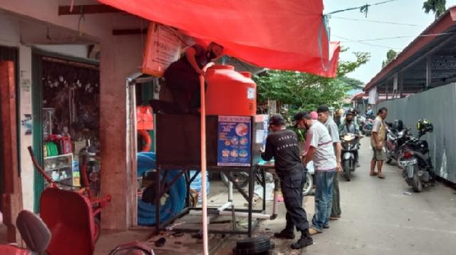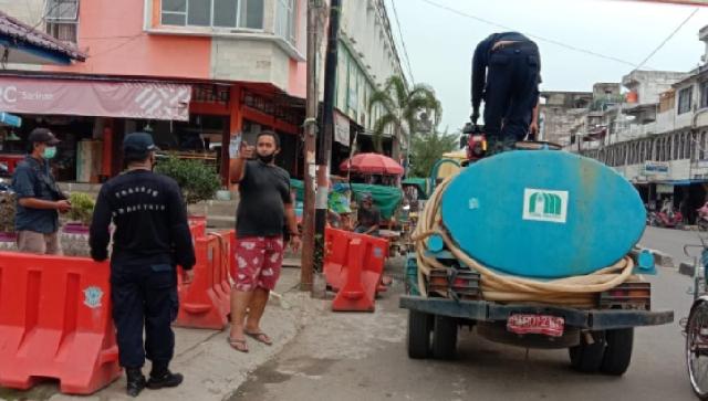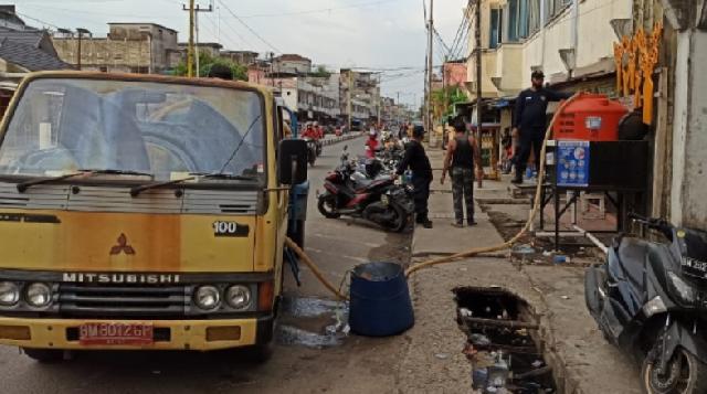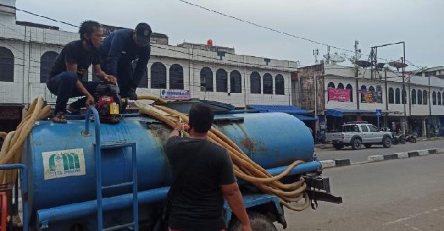TEMBILAHAN (MR) - Para petugas dari Dinas Perdagangan dan Perindustrian (Disdagtri) Kabupaten Indragiri Hilir (Inhil) melakukan pengisian air bersih di sejumlah titik keraiaman yakni area pasar Tembilahan dan Tembilahan Hulu, kemarin.