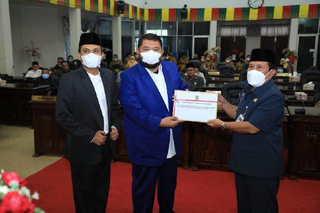 Bupati Sukiman saat menyerhakan laporan LKPJ 2021 kepada ketua DPRD Rohul.