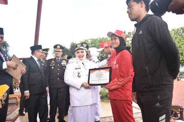 Bupati Bengkalis, Kasmarni saat memberikan penghargaan bagi Atlit berprestasi
