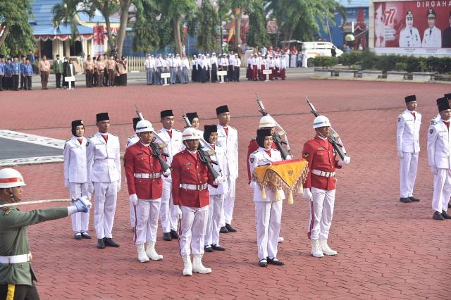 Selanjutnya yang bertugas sebagai pengibar bendera merah putih Aditya Irmansyah Lubis dari SMAN 1 Mandau, Yohanes Marbun SMAN 6 Bathin Solapan dan Ibnu Syawal dari Pondok Modern Nurul Hidayah Bengkalis.