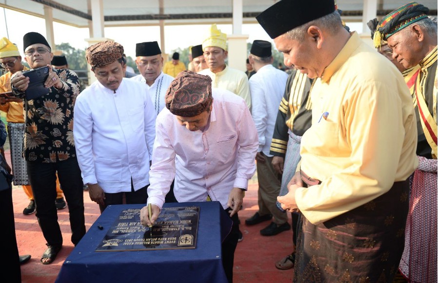 Gubernur Riau Drs H Syamsuar Msi disaksikan PJ Bupati Kampar dan para ninik mamak menandatangani prasasti sebelum memberikan bantuan kepada masyarakat.