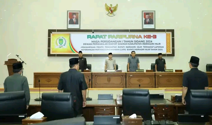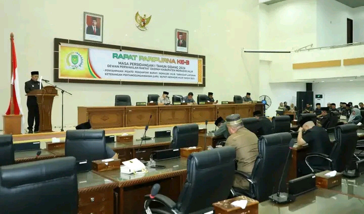 TEMBILAHAN (MR) - Dewan Perwakilan Rakyat Daerah (DPRD) Kabupaten Indragiri Hilir (Inhil) menyelenggarakan Rapat Paripurna Ke-3 Masa Persidangan I Tahun Sidang 2024 di Gedung Utama DPRD Inhil, Jalan HR Soebrantas, Tembilahan, Senin (1/4/2024).