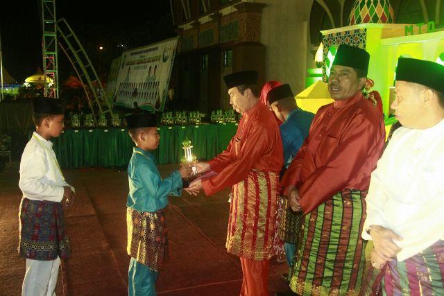 Bupati Siak menyerahkan piala bergilir kepada Camat Siak atas prestasi Kafilah Kecamatan Siak yang menjadi juara umum MTQ tahun ini