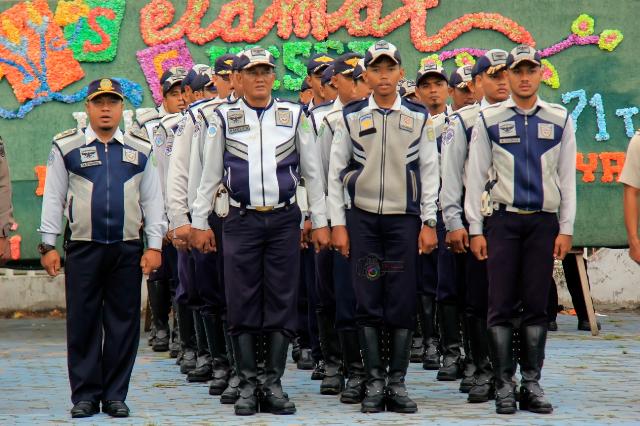 Pasukan Lalu lintas jalan raya Dishub Dumai mengikuti upacara