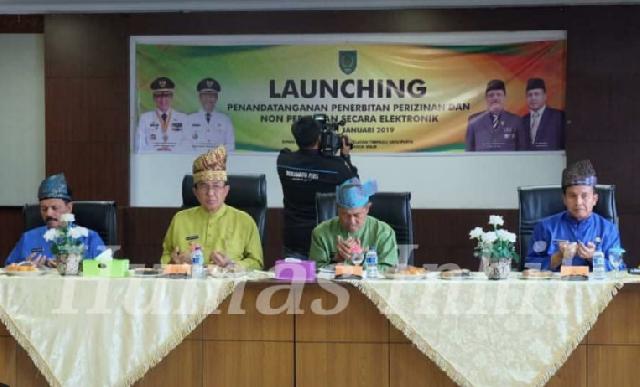 TEMBILAHAN (MR) - Bupati Indragiri Hilir (Inhil) HM Wardan, melaunching Penandatanganan Penerbitan Perizinan dan Non Perizinan Secara Elektronik, Kamis (31/1/2019) petang.