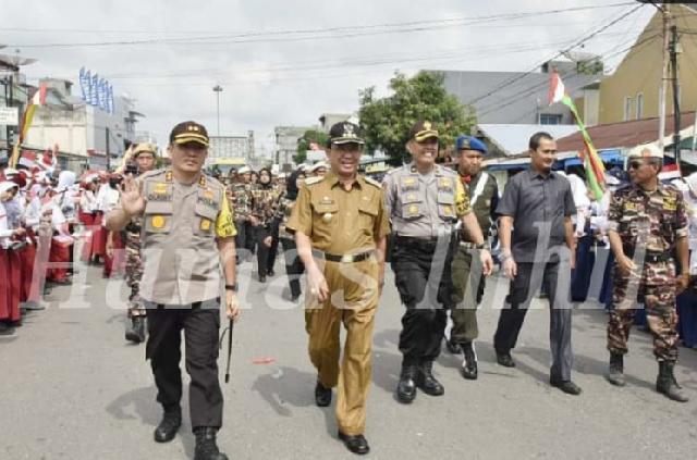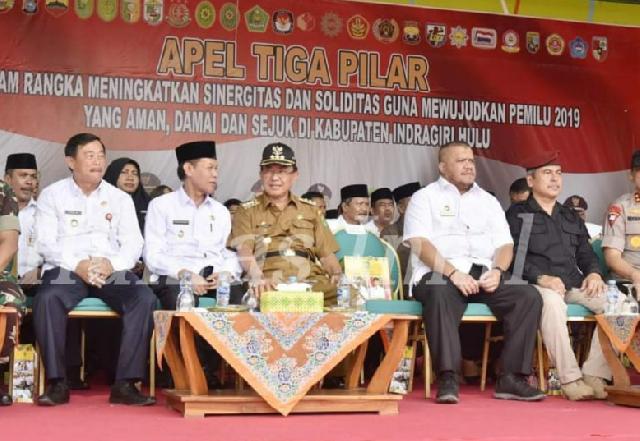 TEMBILAHAN (MR) - Bupati Kabupaten Inhil mengikuti Apel 3 Pilar Gabungan di lapangan hijau terbuka, Jalan HM Amin, Kota Rengat, Rabu (13/2/2019) pagi. Apel 3 pilar digelar dalam rangka menghadapi Pemilu Legislatif dan Pemilu Presiden pada April 2019 mendatang.
