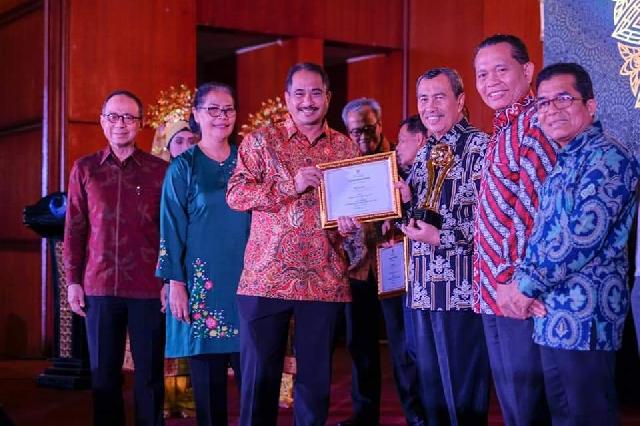 Gubernur Riau Drs H Syamsuar M.Si memakai baju batik dengan corak Istana Siak saat mnerima penghargaan destinasi wisata halal di Indonesia dari Menteri Pariwisata RI, Arief Yahya.