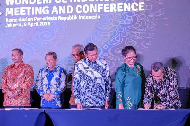 Dengan mengenakan baju batik hitam dengan corak Istana Siak Gubernur Riau Drs H Syamsuar M.Si menandatangani MoU tentang pengembangan pariwisata halal di Riau.