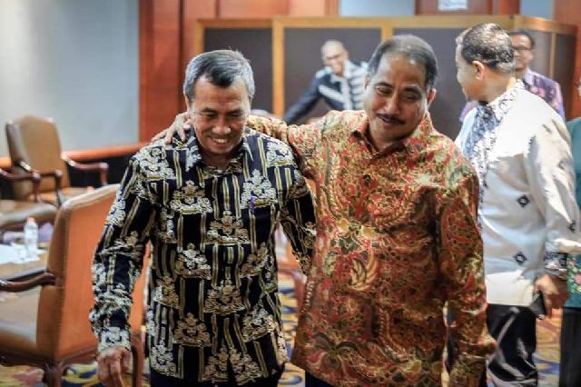 Gubernur Riau Drs H Syamsuar M.Si dan Menteri Pariwisata RI, Arief Yahya sama-sama memakai baju batik yang merupakan warisan budaya Indonesia sejak dulu.