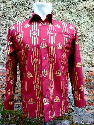 Motif baju batik dengan corak Istana Siak berwarna merah yang diproduksi usaha UMKM milik Deni warga Kelurahan Kampung dalam Kecamatan Siak.