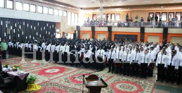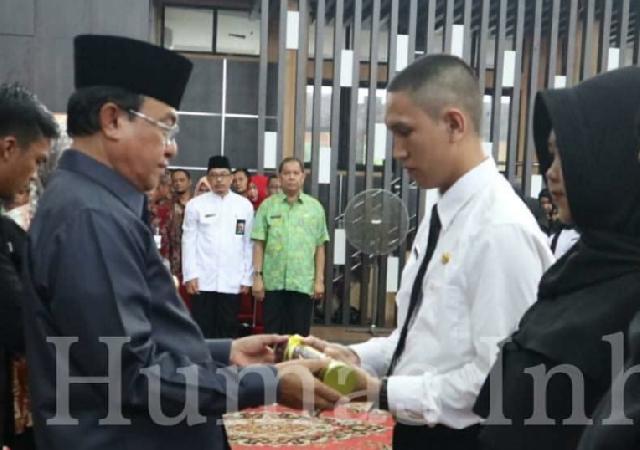 TEMBILAHAN (MR) - Bupati Kabupaten Inhil, HM Wardan menyerahkan Surat Keputusan Calon Pegawai Negeri Sipil (SK CPNS) kepada 329 orang CPNS yang dinyatakan lulus seluruh tahapan tes dari Formasi Umum tahun 2018 silam, Jum'at (1/2/2019) di gedung Engku Kelana, Tembilahan.