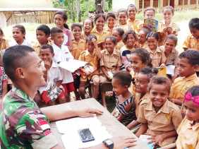 Tingkatkan Minat Baca, Perpustakaan Keliling Satgas Yonif 132/BS, Cerdaskan Generasi Anak Bangsa