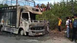 Bangkai truk pengangkut pisang yang terbakar di Simalungun menyebabkan dua orang tewas dan dua menga