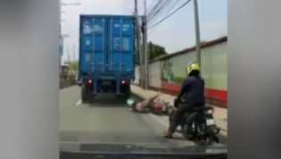 Video Detik-detik Pemotor Nyaris Terlindas Truk Kontainer