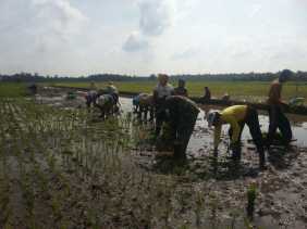 Babinsa Seberang Pebenaan Dampingi Tanam Padi Sistem Jajar Legowo