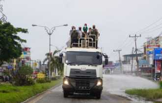 Polres dan Pemkab Pelalawan Lakukan Penyemprotan Disinfektan di Pangkalan Kerinci