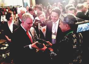 Alfedri Sematkan Tanjak Siak Kepada Presiden Kolombia